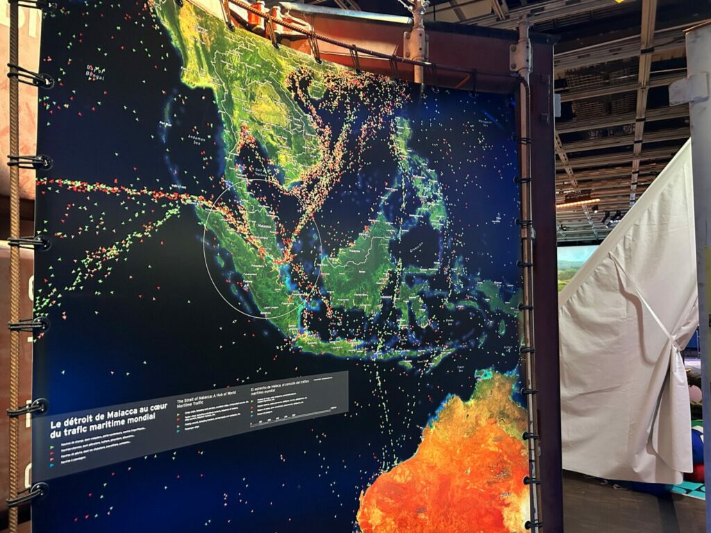 Delphine nous précise que cette exposition est une ressource pédagogique en elle-même du fait des thèmes qu’elles abordent : « ce sont des sujets qui se retrouvent dans les manuels que ce soit au collège ou au lycée ». Pour la muséographe, « Frontière » apporte un côté « rafraichissant à la matière » étant donné sa scénographie marquante, une mise en scène dynamique et des dispositifs « interactifs ». Par exemple, l’exposition propose un jeu de l’oie pour découvrir le détroit de Malacca. Delphine conclut : « bien que l’exposition soit conseillée aux enfants à partir de 12 ans, sa présentation la rend accessible à tous ».